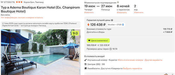 Adema Boutique Karon Hotel 3* с завтраками 63.200 рублей за человека (126.400 рублей за двоих)
