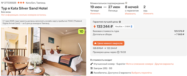 Kata Silver Sand Hotel 3* с завтраками 66.600 рублей за человека (133.200 рублей за двоих)