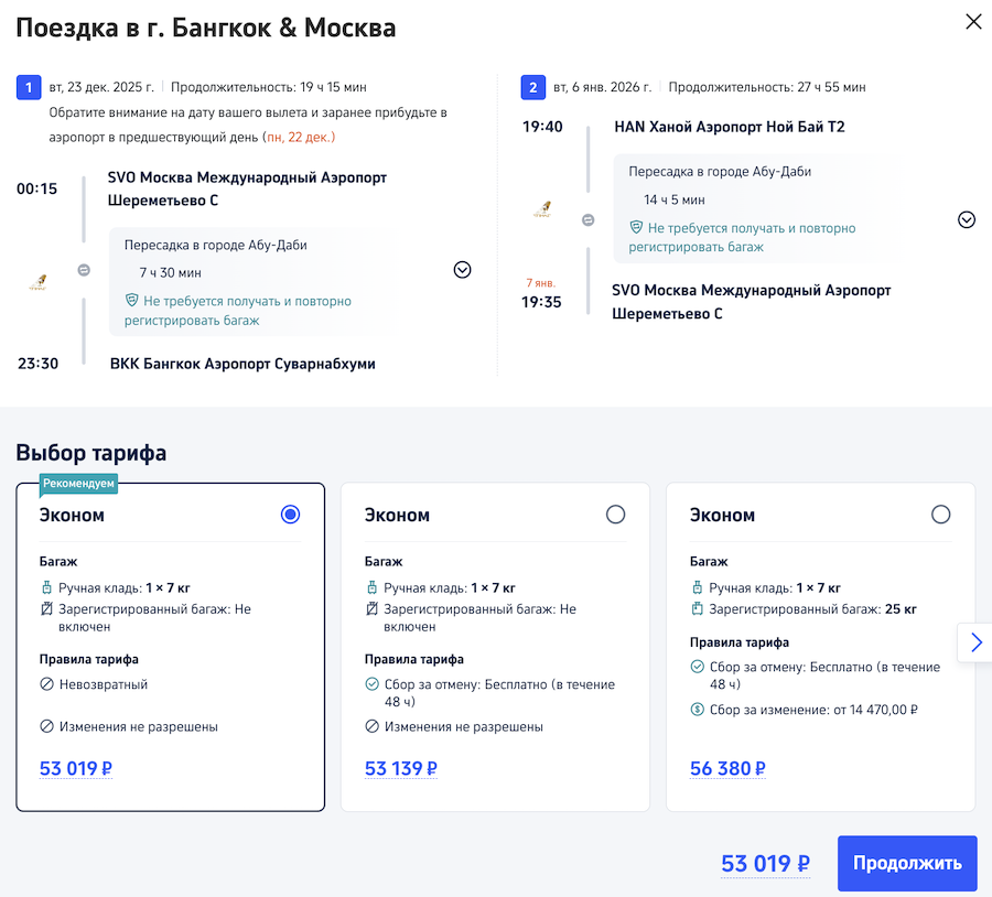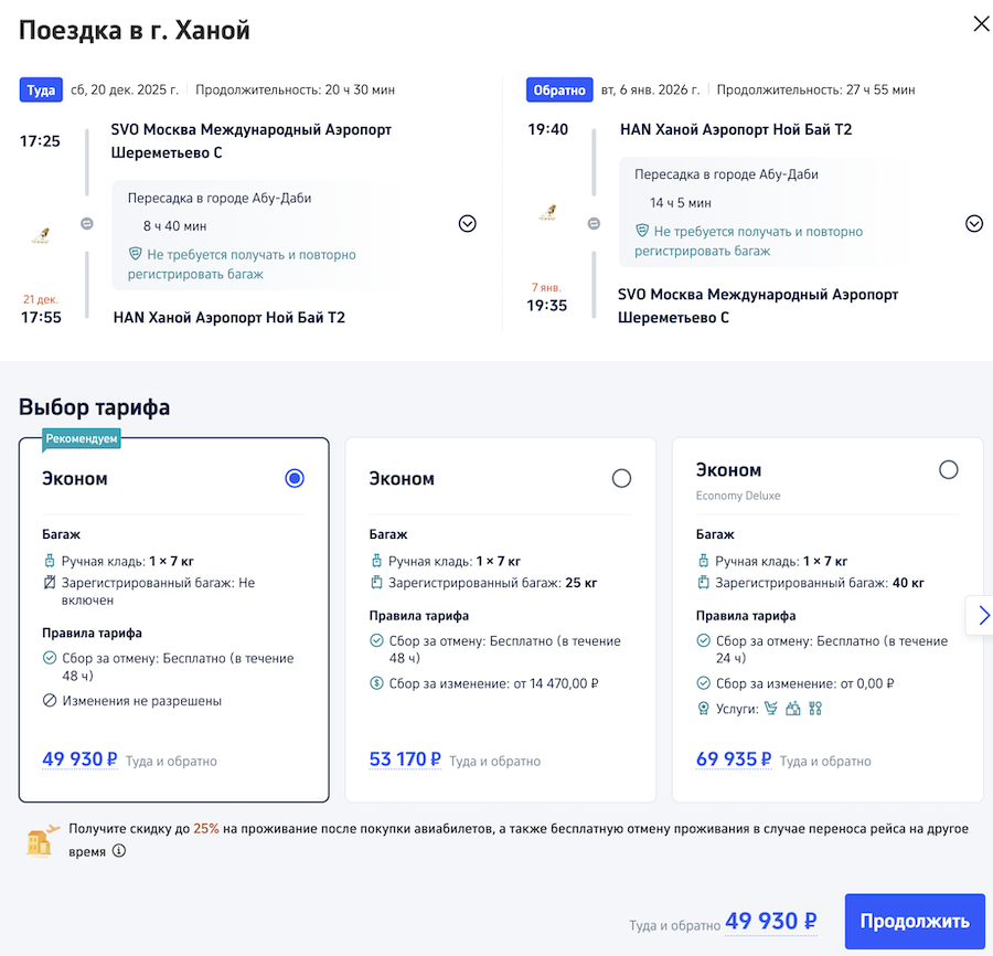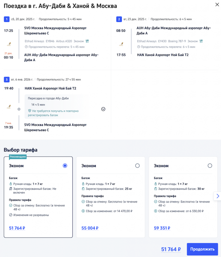 Вы можете остановиться на несколько дней в Абу-Даби. Например, Москва — Абу-Даби 20 декабря, Абу-Даби — Ханой 23 декабря, Ханой — Москва 6 января.