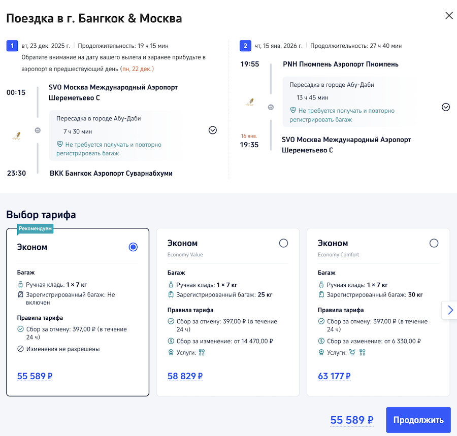 Москва — Бангкок 23 декабря, Пномпень — Москва 15 января