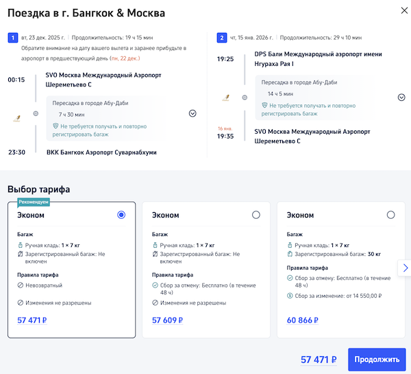 Москва — Бангкок 23 декабря, Бали — Москва 15 января