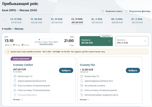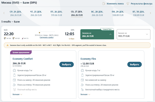 На сайте авиакомпании (оплата зарубежной картой) можно взять билеты на Бали за 533 евро — с двумя пересадками в Маскате и Куала-Лумпуре. Но сегменты Куала-Лумпур — Бали будут выписаны в бизнес-классе (вы можете выбрать рейсы на широкофюзеляжных А330).