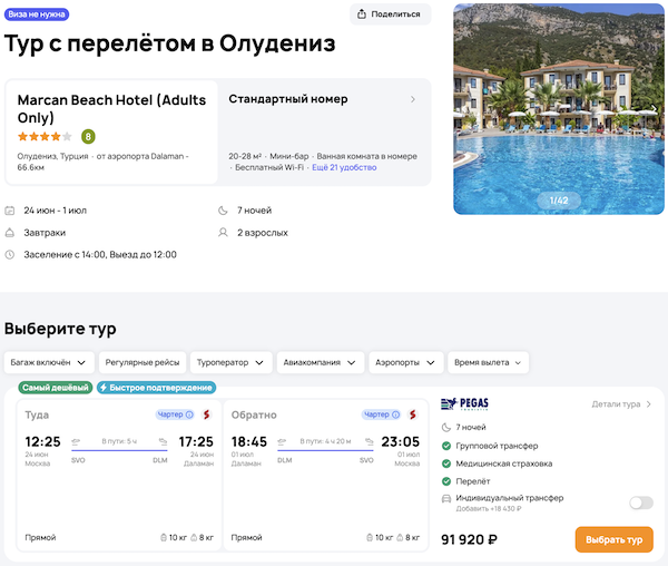 Туры из Москвы в Олюдениз от 45.900 рублей за человека.
