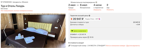 Отель Лазурь 10.500 рублей за человека (20.900 рублей за двоих)