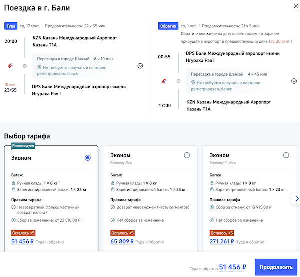 Из Казани на Бали в сентябре от 51.500 рублей туда-обратно.