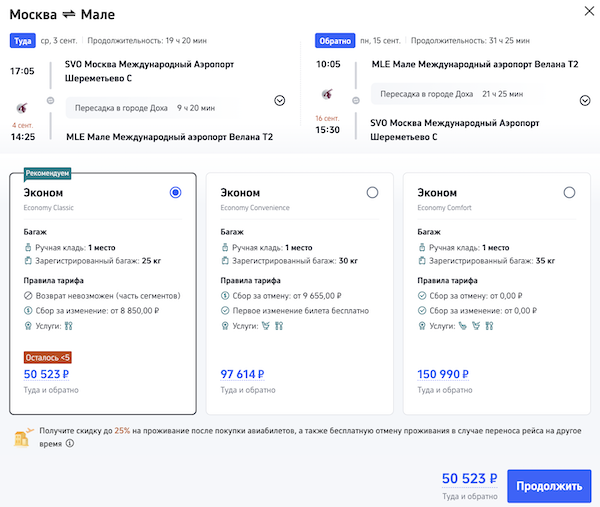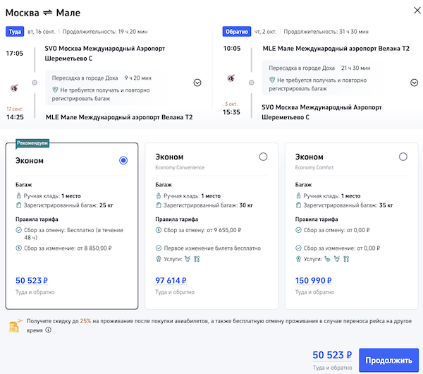 Qatar Airways: из Москвы на Мальдивы от 50.300 рублей туда-обратно.