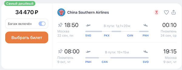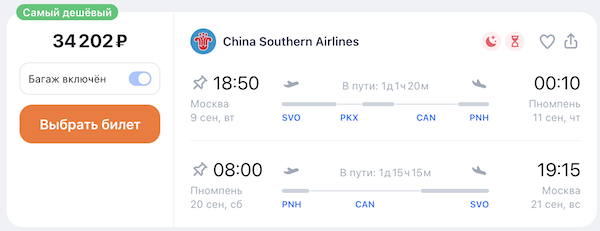 Рейсы выполняются авиакомпанией China Southern с пересадкой в Пекине и Гуанчжоу по дороге из Москвы и одной пересадкой в Гуанчжоу на обратном пути.