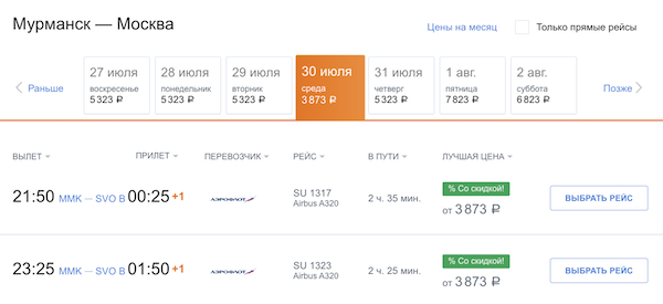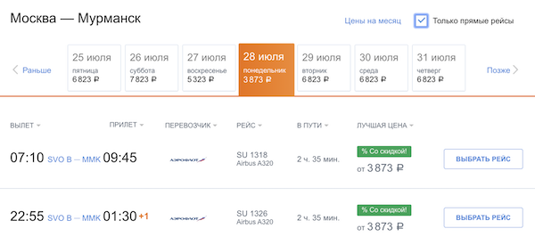 Из Москвы в Мурманск Аэрофлотом от 7.700 рублей туда-обратно.