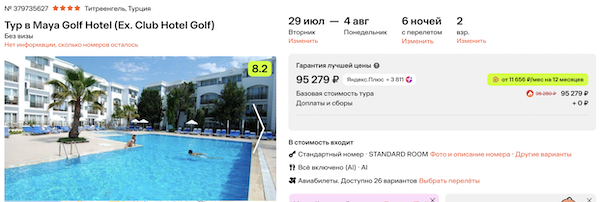 Maya Golf Hotel 4* все включено 47.600 рублей за человека (95.300 рублей за двоих)
