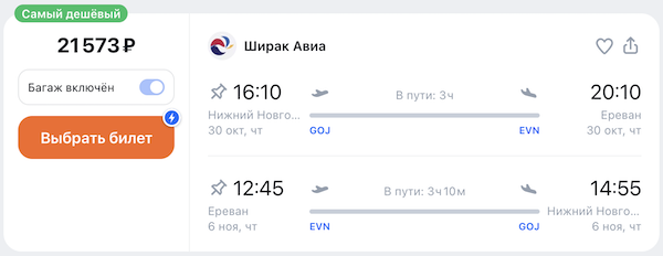 Например, Нижний Новгород — Ереван с 30 октября по 6 ноября