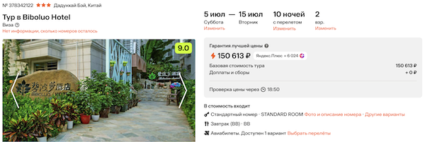 Biboluo Hotel 3* с завтраками 75.300 рублей за человека (150.600 рублей за двоих)