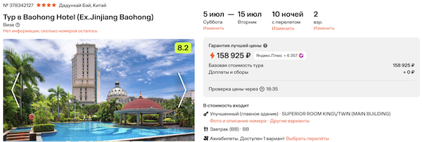 Baohong Hotel 4* с завтраками 79.400 рублей за человека (158.900 рублей за двоих)