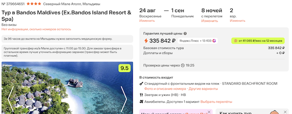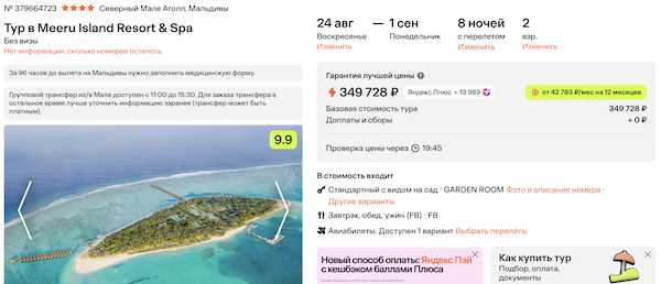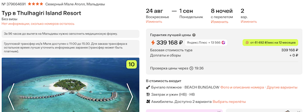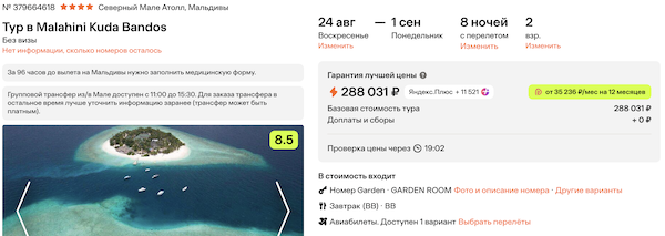 Туры из Москвы на Мальдивы в конце лета от 144.000 рублей за человека.
