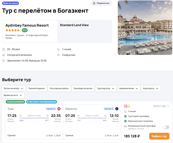 Aydinbey Famous Resort 92.500 рублей за человека (185.100 рублей за двоих)