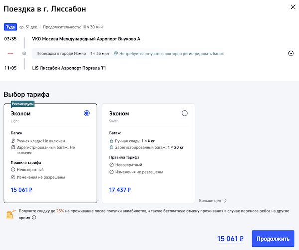 Из Москвы в Лиссабон 31 декабря с короткой пересадкой в Измире 15.100 рублей.