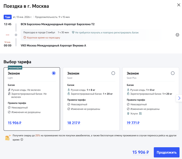 Обратно из Барселоны с короткой пересадкой в Стамбуле. Например, 14 января 15.900 рублей.