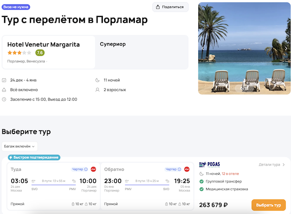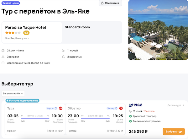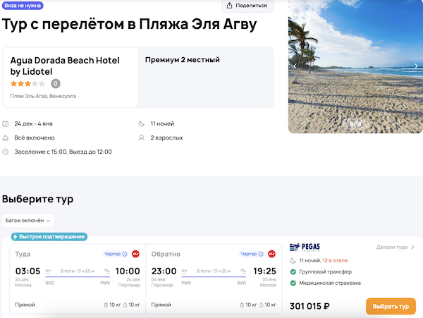 Туры на Новый год в Венесуэлу: прямой перелет из Москвы на остров Маргарита, трансферы и 11 ночей в отеле от 122.500 рублей за человека.