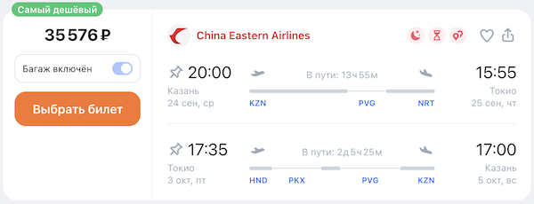 Билеты из Казани в Японию (Токио) в сентябре от 35.600 рублей туда-обратно.