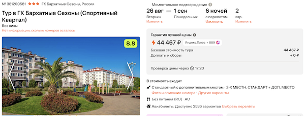 Бархатные Сезоны (Спортивный Квартал) 3* 22.200 рублей за человека (44.500 рублей за двоих)
