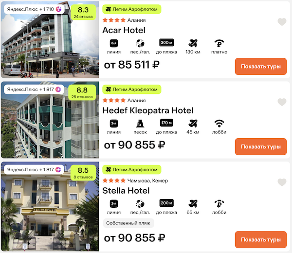 Стоимость в примерах указана за одного человека при условии поездки вдвоем. Стоимость туров для 1 человека можно посмотреть здесь или на странице отелей, изменив количество туристов.