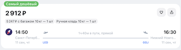 Билеты между Санкт-Петербургом и Нижним Новгородом в сентябре от 2.900 рублей в каждую сторону.