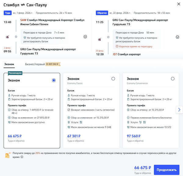 Из Стамбула в Сан-Паулу рейсами Qatar Airways от 66.700 рублей туда-обратно.