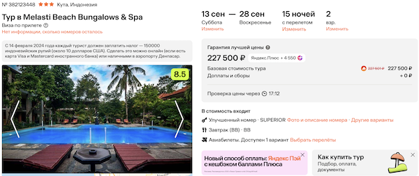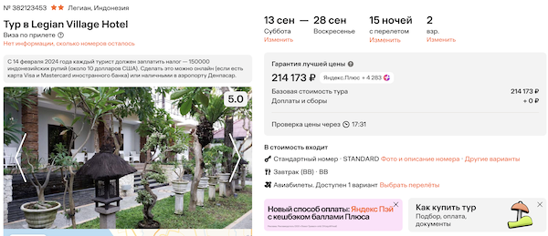 Legian Village Hotel 2* с завтраками 107.100 рублей за человека (214.200 рублей за двоих)