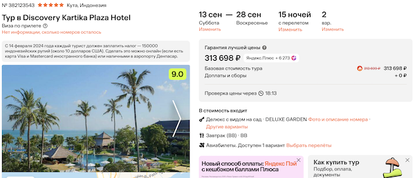Discovery Kartika Plaza 5* с завтраками 156.800 рублей за человека (313.700 рублей за двоих)