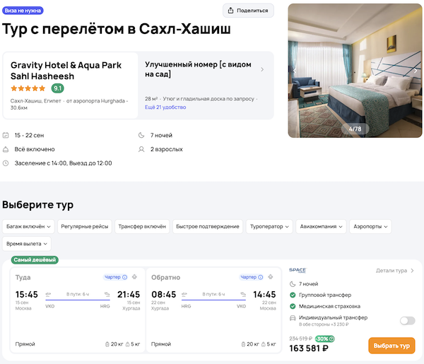 Gravity Hotel & Aqua Park Sahl Hasheesh 81.800 рублей за человека (163.600 рублей за двоих)
