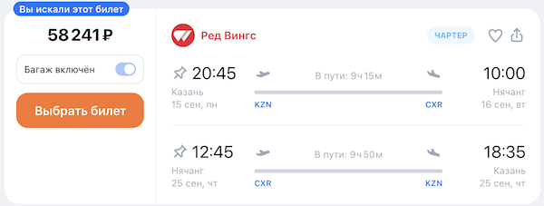 Горящие билеты на прямые чартерные рейсы из Казани во Вьетнам 58.200 рублей туда-обратно.