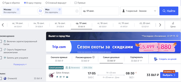 Из Москвы 17 сентября рейсами Qatar Airways с короткой пересадкой в Дохе. Минимальная цена на трип.ком: 33.900 рублей