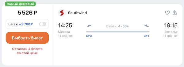 Билеты из Москвы в Анталью в ноябре от 12.500 рублей туда-обратно.