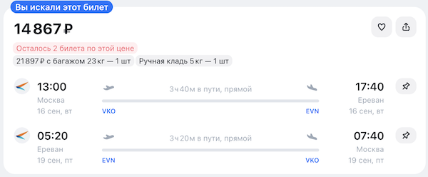 Из Москвы в Армению в сентябре от 12.500 рублей туда-обратно.