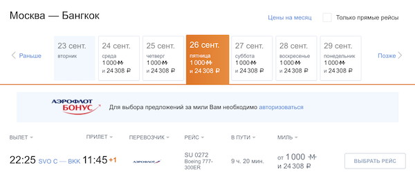 На сайте Аэрофлота выбираем билет с частичной оплатой милями (при поиске отметить чекбокс «За мили»). Любые ближайшие даты 1.000 миль и 24.300 рублей (багаж включен, за перелет начислят мили)