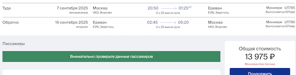 Из Москвы в Ереван в сентябре от 14.000 рублей туда-обратно.