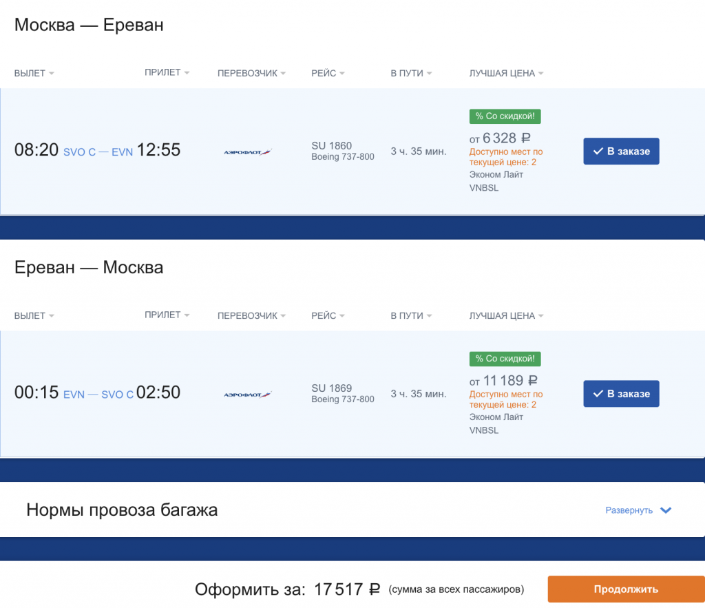 Аэрофлот: из Москвы в Ереван в октябре от 17.500 рублей туда-обратно.
