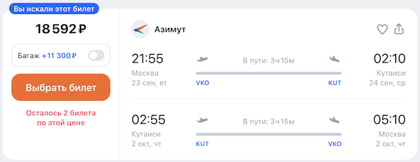 Из Москвы 21, 23, 28, 30 сентября, 1, 7, 10, 12, 15 октября. Из Кутаиси 2, 8, 11, 13, 14, 16 октября.