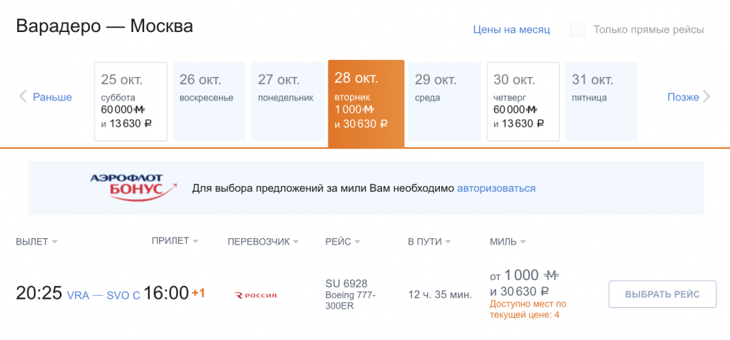 2. Снова на сайте Аэрофлота: билеты из Варадеро в Москву 28 октября 30.600 рублей и 1.000 миль (не забудьте про чекбокс «За мили»).