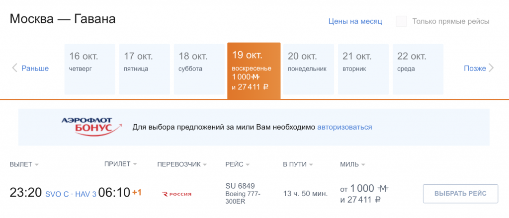 1. На сайте Аэрофлота билеты из Москвы в Гавану по воскресеньям в октябре стоят 27.400 рублей и 1.000 миль (при поиске отметьте чекбокс «За мили»).