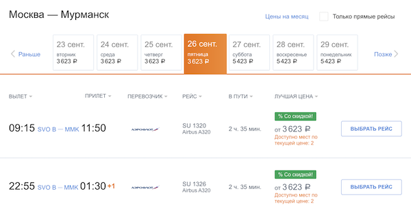 Москва — Мурманск в понедельник 22 сентября, билеты на авиасейлс
