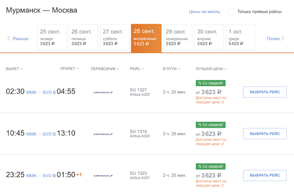 На выходные 26-28 сентября (вечер пятницы — вечер воскресенья) есть билеты у Аэрофлота за 7.200 рублей