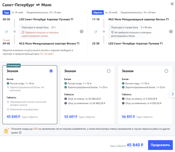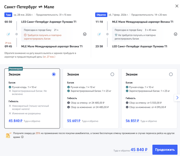 Билеты из Санкт-Петербурга на Мальдивы зимой от 45.800 рублей туда-обратно.