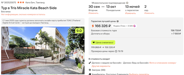 Tris Miracle Kata Beach Side 3* с завтраками 83.100 рублей за человека (166.300 рублей за двоих)