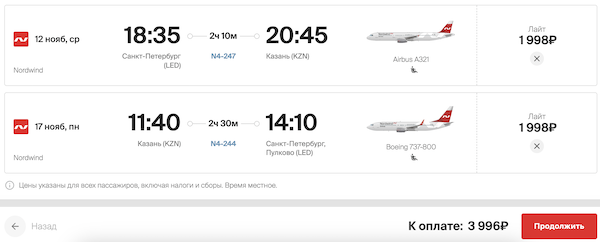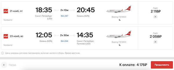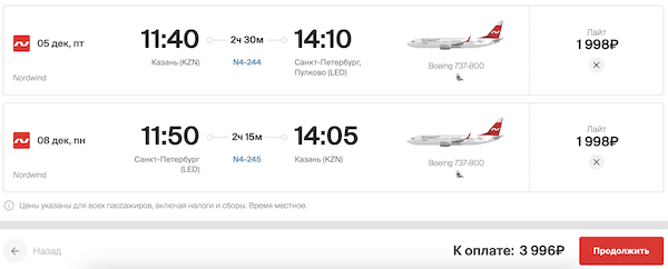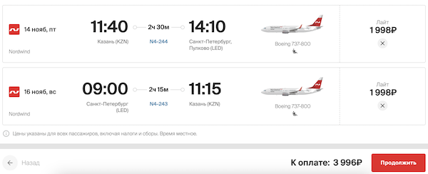 Билеты между Казанью и Санкт-Петербургом от 4.000 рублей туда-обратно.