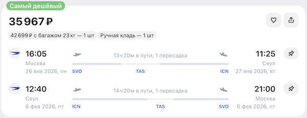 Билеты из Москвы в Сеул зимой от 36.000 рублей туда-обратно.