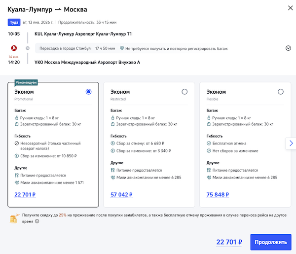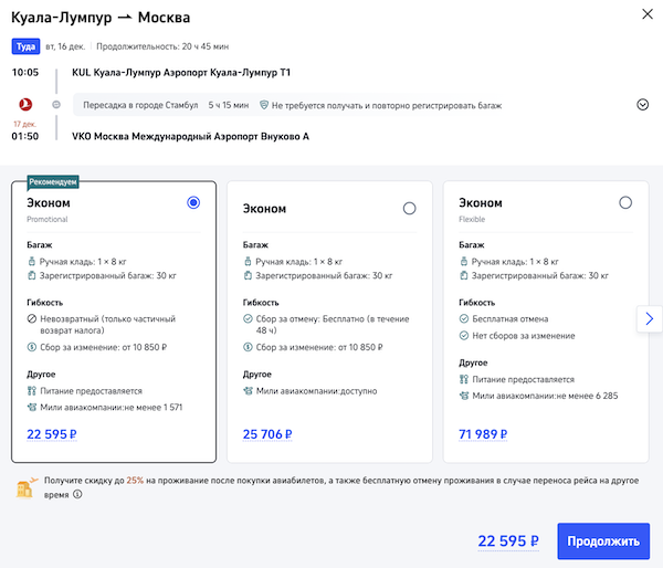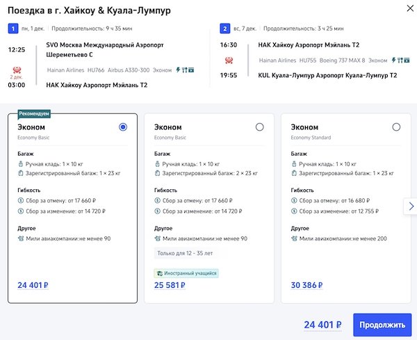 Например, прямой рейс из Москвы в Хайкоу 1 декабря, Хайкоу — Куала-Лумпур 7 декабря