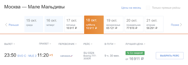 Горящие билеты на прямые рейсы Аэрофлота из Москвы на Мальдивы 31.600 рублей туда-обратно.