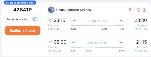Рейсы авиакомпании China Southern выполняются с пересадкой в Гуанчжоу.