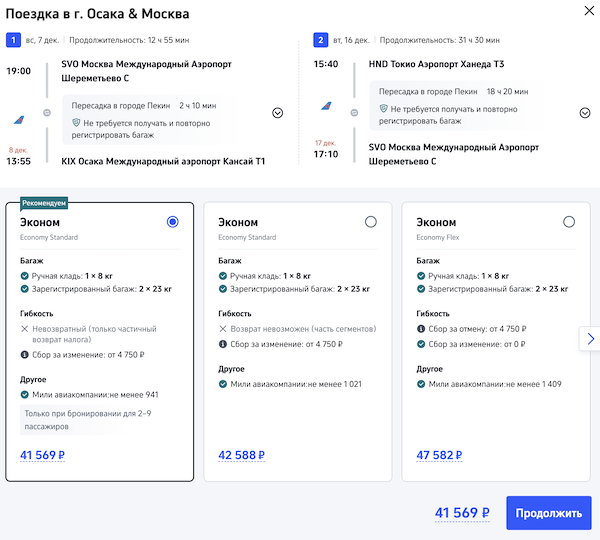 Составной маршрут: прилет в Осаку, обратный рейс из Токио
