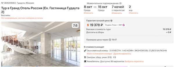 Из Санкт-Петербурга в Абхазию: горящие билеты 1.000 рублей в одну сторону, туры от 8.300 рублей за человека на неделю.